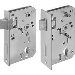 rechts und links verwendbar durch umdrehbaren Fallenkopf. Wahlweise vorgerichtet für Profilzylinder (PZ), Schweizer Rundzylinder (RZ) oder für Buntbart-Nachrüstsatz. Mit Wechsel. Riegel aus Zink-Druckguss.