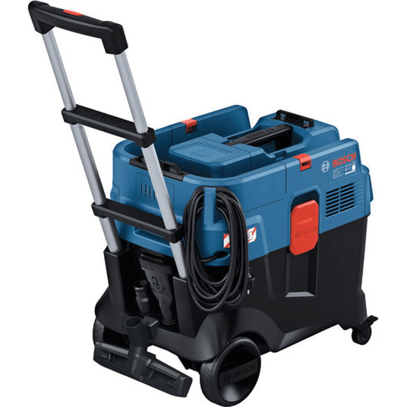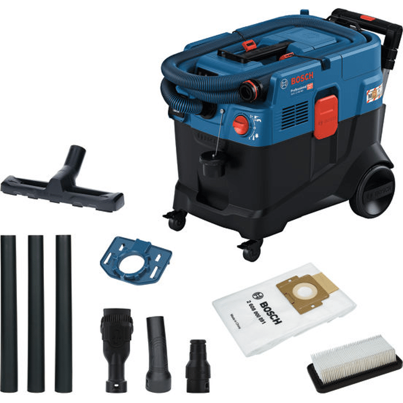 Allzwecksauger GAS 12-40 MA, Wenn bei der Arbeit feiner oder grober Staub entsteht, wird ein Sauger gebraucht, der für saubere Luft zum Atmen und eine gute Sichtbarkeit durch eine staubfreie Arbeitsfläche sorgt, ohne dass ein verstopfter Filter die Arbeit verlangsamt. Unser GAS 12-40 MA Professional bietet hohen Schutz gegen das Einatmen von Staub, indem er 99,9 % der Partikel einsaugt. Er spart außerdem Zeit, indem er den Filter dank Bosch-eigener, exklusiver automatischer Filterreinigungstechnologie (AFC) frei von Verstopfungen hält. Mit seinem starken, konstanten Luftstrom ermöglicht er einen schnelleren Arbeitsabschluss. Der Bosch GAS 12-40 MA Professional macht durch den schlauchlosen Behälter und den unabhängigen, kippsicheren Kopf auch die Staubentsorgung leichter und schneller. Für mühelosen Transport von Baustelle zu Baustelle sorgen Teleskopgriff, L-BOXX-Kompatibilität und kompakte Lagerung. Der Bosch GAS 12-40 MA Professional saugt die meisten Materialien ab, einschließlich nassen oder trockenen und feinen oder groben Staub, der beim Schneiden von Beton, Abschleifen, Sägen von Gipsplatten und Schleifen von Trockenwänden anfällt. Er bietet hohen Schutz, damit du saubere Luft einatmest, und liefert dauerhaft starke Saugkraft für hocheffiziente Staubabsaugung, so dass du die Arbeit schneller erledigen kannst. 1 x Hauptfilter (2 608 000 889). 1 x Schlauch (2 608 000 885). 1 x Kombi-PT-Adapter (2 608 000 886). 1 x Kombi-Bürstendüse (2 608 000 887). 1 x Saugrohr, gekrümmt (2 608 000 769). 1 x Vliesbeutel (2 608 000 891). 1 x Vliesbeutelhalter (2 608 001 109). 1 x Teleskopgriff (2 608 000 890)