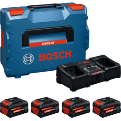Batterie/Ladegerät Set 2x EXBA18V-55 + 2x EXBA18V-80 + EXAL18V2-320, Der leistungsstarke Akku EXBA18V-80 liefert bis zu 120 % mehr Laufzeit selbst in harten Anwendungen (verglichen mit Professional GBA 18V 4.0Ah. interner Labortest. Schleifen auf Weichstahl mit GWS 18V-15 S + Fächerscheibe, Intervalle von 30 s mit 5 s Pausen). Er basiert auf fortschrittlicher „Tabless“-Zelltechnologie für eine Maximalleistung von bis zu 2400 W (interner Labortest. sofortige Maximalleistung, voll geladener, neuer Akku). Der Hochleistungsakku EXBA18V-55 liefert bis zu 2000 W Maximalleistung für anspruchsvolle Anwendungen in Kombination mit verbesserter Laufzeit (basierend auf internen Labortests. sofortige Maximalleistung mit voll geladenem neuem Akku). Mit ihrem verstärkten, robusten Gehäuse und dem hervorragenden Wärmemanagement mit COOLPACK 2.0 sorgen beide Akkus für Robustheit und eine lange Lebensdauer. Das EXAL18V2-320 lädt zwei Akkus gleichzeitig mit 16 A, sodass zwei EXBA18V-80-Akkus in nur 39 Minuten und zwei EXBA18V-55-Akkus in 31 Minuten vollständig geladen werden. Das Ladegerät verfügt über die intelligenten Technologien Active Air Cooling 3.0 und FlexTemp Charging, die den Temperaturbereich auf von -10 °C bis +55 °C erweitern. Es reduziert die Ausfallzeiten erheblich, indem es ein schnelles Aufladen von warmen und kalten Akkus ermöglicht, die alle bequem in der speziell angefertigten L-BOXX aufbewahrt werden. Der EXBA18V-80 und der EXBA18V-55 besitzen eine 5-LED-Anzeige für den Ladezustand mit Restkapazität und Defektrisikoerkennung. Das mobile, ultraschnelle Parallelladegerät bietet drei Lademodi, Standard, Power Boost und Long Life, und verfügt über 5 LEDs für eine präzise Ladeanzeige. Kompatibel mit dem Bosch Professional 18V System und der markenübergreifenden AMPShare Akku-Allianz. Der EXBA18V-80 wiegt 1,04 kg, während der EXBA18V-55 ein Gewicht von 1,02 kg hat. L-BOXX 162 Größe 5 (1 605 438 1L3)