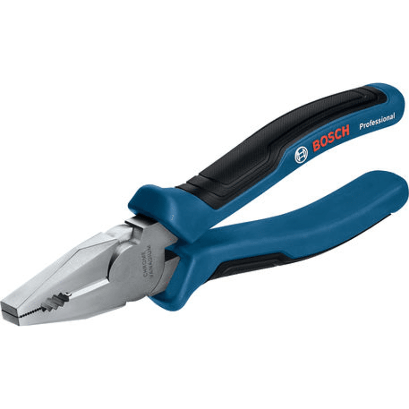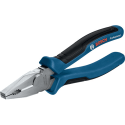 Zange Universalzange, Die Bosch Professional Kombinationszange ist aus hochfestem Chrom-Vanadium-Stahl mit speziell gehärteten Schneidekanten für eine längere Lebensdauer. Das optimierte Design mit großer Hebelwirkung erfordert bis zu 30 % weniger Krafteinsatz beim Schneiden als bei normalen Zangen, und der weiche Gummigriff mit rutschfesten Seitenelementen sorgt für eine bequeme und sichere Anwendung, besonders bei einhändiger Bedienung. Der maximale Schnittdurchmesser beträgt bei Weichdraht (220 N/mm²) 4,0 mm, bei Hartdraht (2.030 N/mm²) 2,0 mm Hängeschild