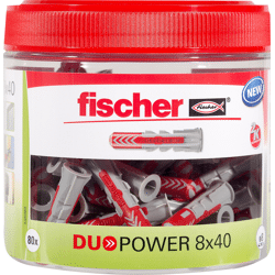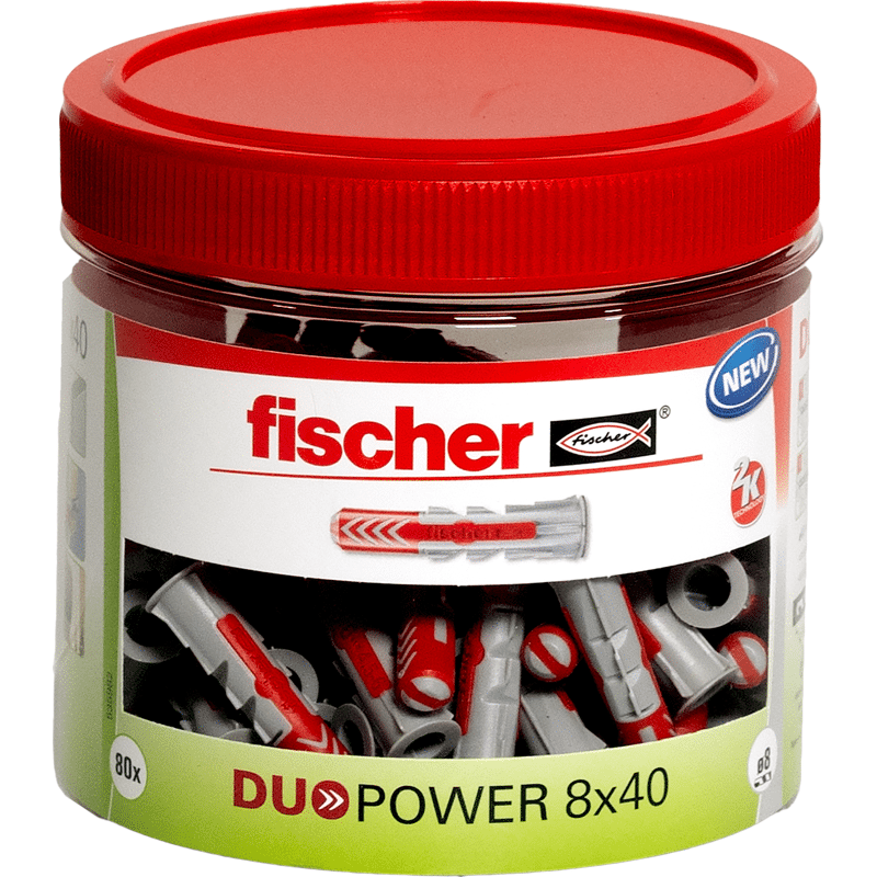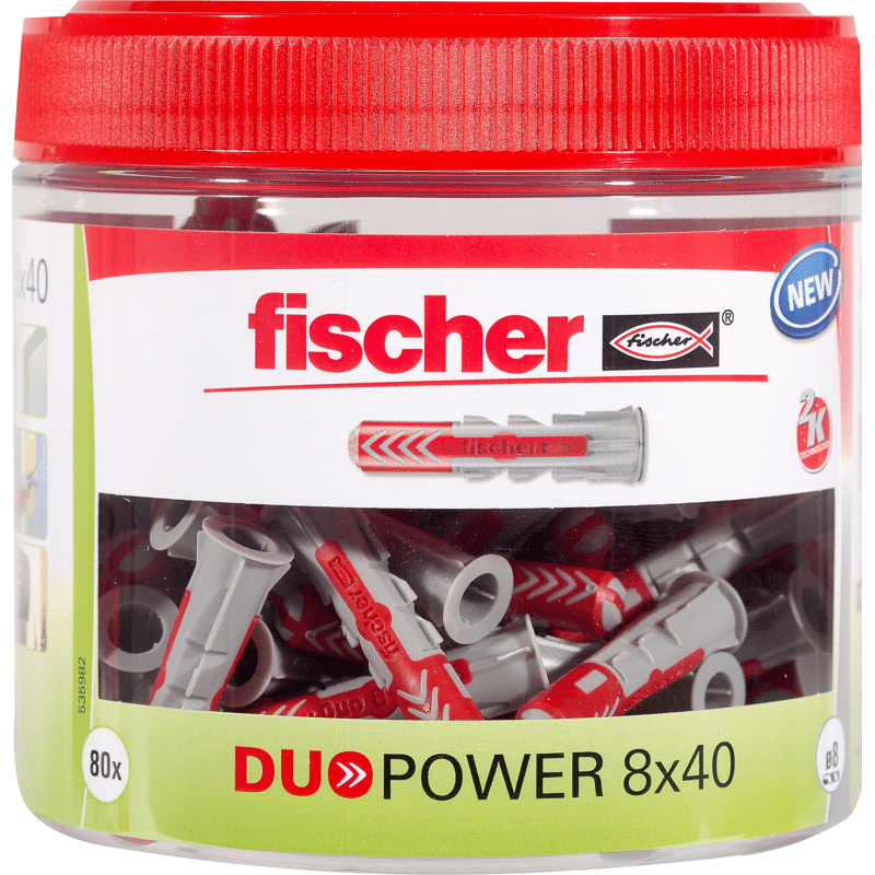 Der fischer DuoPower bietet sehr gute Haltewerte durch 2 Komponenten: Die graue Komponente aus hochwertigem Nylon aktiviert je nach Baustoff automatisch das optimale Funktionsprinzip (Spreizen, Klappen, Knoten) für besten Halt. Die Expansionsflügel der roten Komponente unterstützen die sichere Verspreizung und bieten zusätzliche Sicherheit zur grauen Komponente. Einfaches Eindrehen der Schraube und richtiges „Ziehen“ zum Schluss. Kein Überdrehen der Schraube. Der am Dübelkopf angeformten Rand verhindert, dass der Dübel ins Bohrloch rutscht.