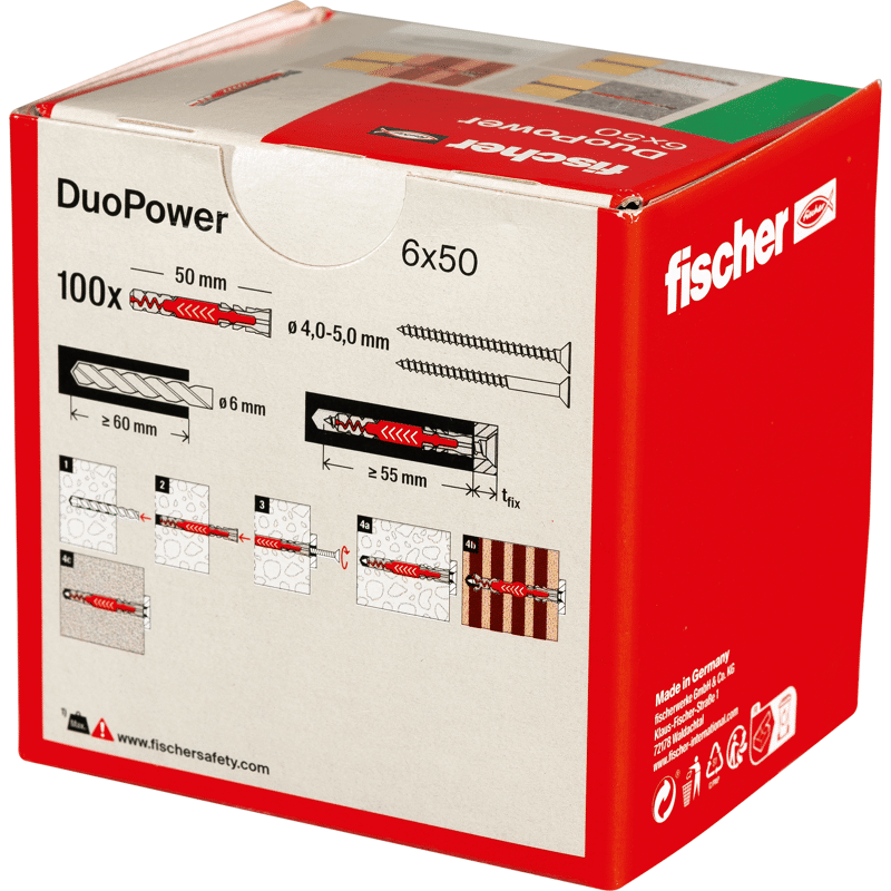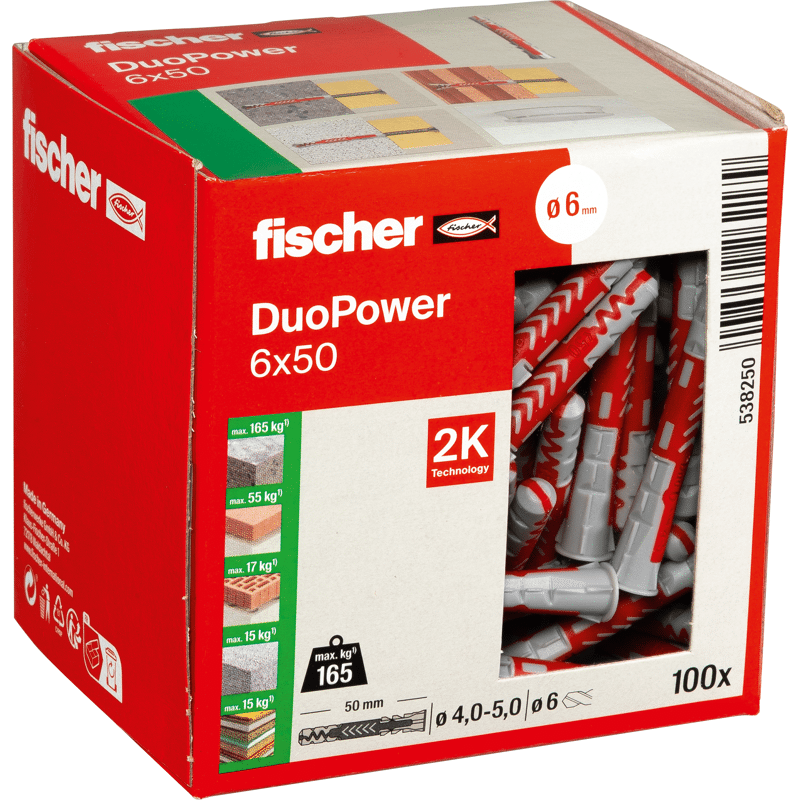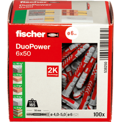 Der fischer DuoPower bietet sehr gute Haltewerte durch 2 Komponenten: Die graue Komponente aus hochwertigem Nylon aktiviert je nach Baustoff automatisch das optimale Funktionsprinzip (Spreizen, Klappen, Knoten) für besten Halt. Die Expansionsflügel der roten Komponente unterstützen die sichere Verspreizung und bieten zusätzliche Sicherheit zur grauen Komponente. Einfaches Eindrehen der Schraube und richtiges „Ziehen“ zum Schluss. Kein Überdrehen der Schraube. Der am Dübelkopf angeformten Rand verhindert, dass der Dübel ins Bohrloch rutscht.