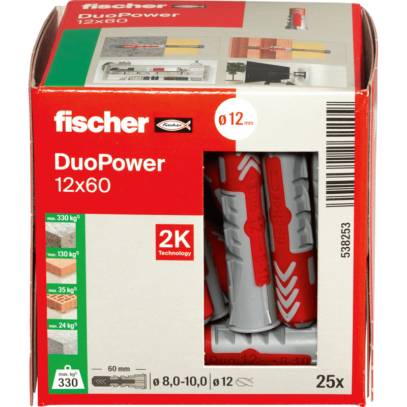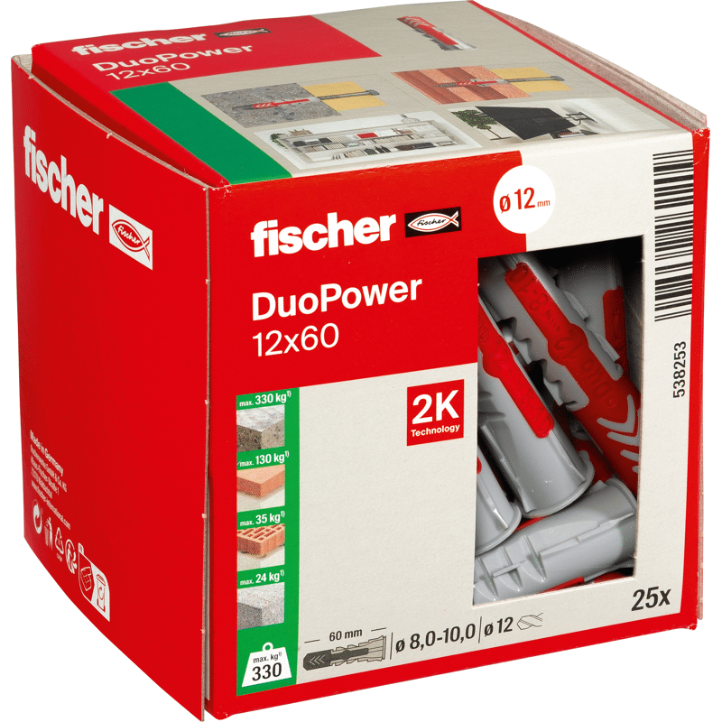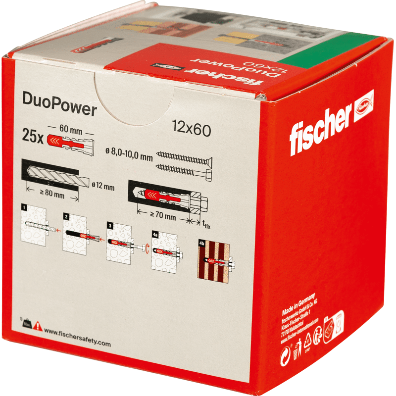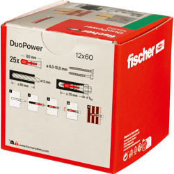 Der fischer DuoPower bietet sehr gute Haltewerte durch 2 Komponenten: Die graue Komponente aus hochwertigem Nylon aktiviert je nach Baustoff automatisch das optimale Funktionsprinzip (Spreizen, Klappen, Knoten) für besten Halt. Die Expansionsflügel der roten Komponente unterstützen die sichere Verspreizung und bieten zusätzliche Sicherheit zur grauen Komponente. Einfaches Eindrehen der Schraube und richtiges „Ziehen“ zum Schluss. Kein Überdrehen der Schraube. Der am Dübelkopf angeformten Rand verhindert, dass der Dübel ins Bohrloch rutscht.
