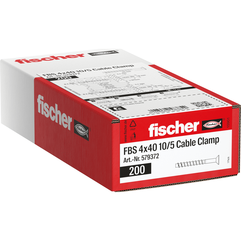 Die fischer Betonschraube FBS 4 Kabelschellenschraube ist eine Verankerungslösung aus galvanisch verzinktem Stahl mit einem Kopf ideal für die Befestigung von Kabelschellen. Beim Eindrehen der Betonschraube in das Bohrloch schneiden sich die Gewindeflanken formschlüssig in den Untergrund und sorgen für Tragfähigkeit. Der geringe Bohraufwand spart Zeit bei der Montage. Die empfohlenen Lasten für Beton sowie die Eignung für Mauerwerk mit dichtem Gefüge, wie Kalksandvollstein, sowie das Brandgutachten nach R120 garantieren zusätzlich Sicherheit.