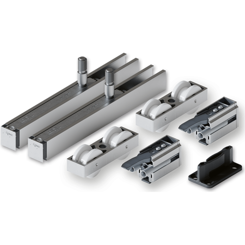 Beschlag mit minimaler Einbauhöhe für oben laufende Holztüren bis 100 kg, mit aufgesetzter oder deckenbündiger Laufschiene. Optional mit Dämpfeinzug. Wand- oder Deckenmontage.