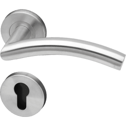 Für den Schwung der Linie 40 im ganzen Haus, gibt es die Rosettengarnitur für Buntbart, WC und Profilzylinder. Weiterhin erhalten Sie das Modell als Halb-Garnitur oder Wechselgarnitur. Die Türbeschläge werden aus matt gebürstetem Edelstahl gefertigt. Die Drücker-Form gibt es außerdem für Schutzbeschläge, Langschild-Garnituren und in der Ausführung als Glastürbeschlag.