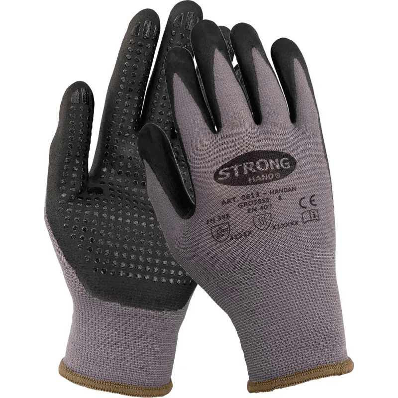 STRONGHAND Arbeitshandschuhe Multi Flex; Profiqualität aus nahtlosem Feinstrick in Nylon Spandex mit Nitril-Mikroschaum Beschichtung u. Nitrilnoppen, sehr gutes Tastgefühl, flüssigkeitsabweisend und beständig gegen öle und Fette, atmungsaktiv, guter Griff bei glatten Gegenständen, dermatologisch getestet