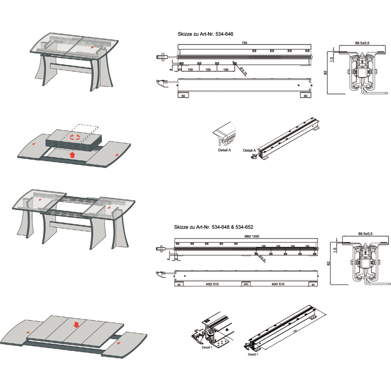• Auszugsystem für Tischkonstruktionen mit Untergestell - Montageart: an der Unterkonstruktion (unter der Tischplatte) - Synchron mit Komfortbremse - Bauhöhe: 82 mm - Tragkraft: 115 kg - Material: Aluminium