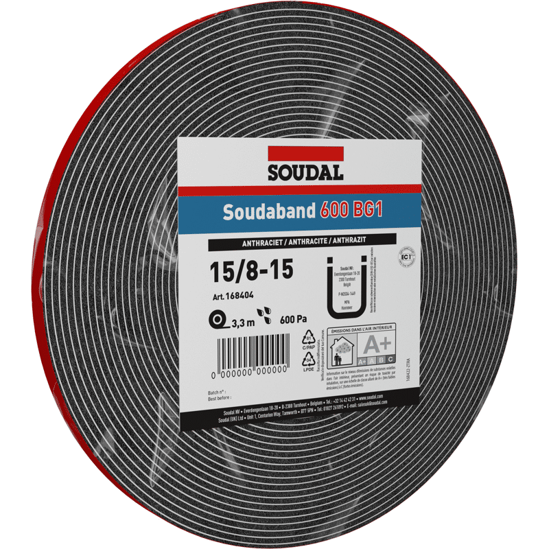 Soudaband 600 BG1 ist ein imprägniertes, vorkomprimiertes BG1-klassifiziertes (nach DIN18542) Fugendichtband mit einer Klebeseite, geeignet für Bewegungsfugen und (Fenster-)Anschlüsse. Es ist schlagregendicht ≥ 600 Pa, dampfdurchlässig, UV-beständig, dauerelastisch und hat hervorragende thermische und akustische Eigenschaften. Soudaband 600 BG1 kann als primäre Dichtungsbarriere verwendet werden. Es kann direkt den Witterungseinflüssen ausgesetzt werden und bedarf keiner weiteren Nachbehandlung.