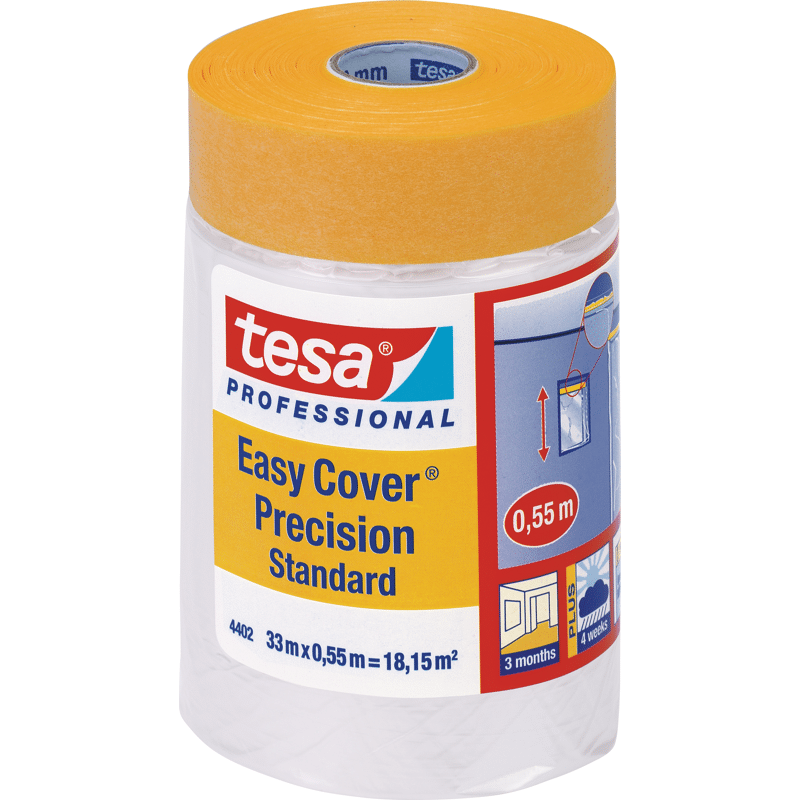 Easy Cover® 4402 ist eine Kombination aus einer lichtdurchlässigen, anschmiegsamen HDPE-Folie und tesa® 4344 Präzisonskrepp® Standard. Die praktische 2-in-1 Lösung zum großflächigen und zeitsparenden Abdecken und Schützen in einem Arbeitsgang. Es ist beständig gegen alle Farben und ermöglicht eine leichte Entfernbarkeit bis zu 3 Monaten im Innenbereich und kurzzeitig 1 Monat im Außenbereich. Für eine sichere Fixierung auf glatten und leicht strukturierten Oberflächen. Die geprägte Abdeckfolie verhindert ein Herablaufen und Tropfen der Farbe an den zu schützenden Flächen.